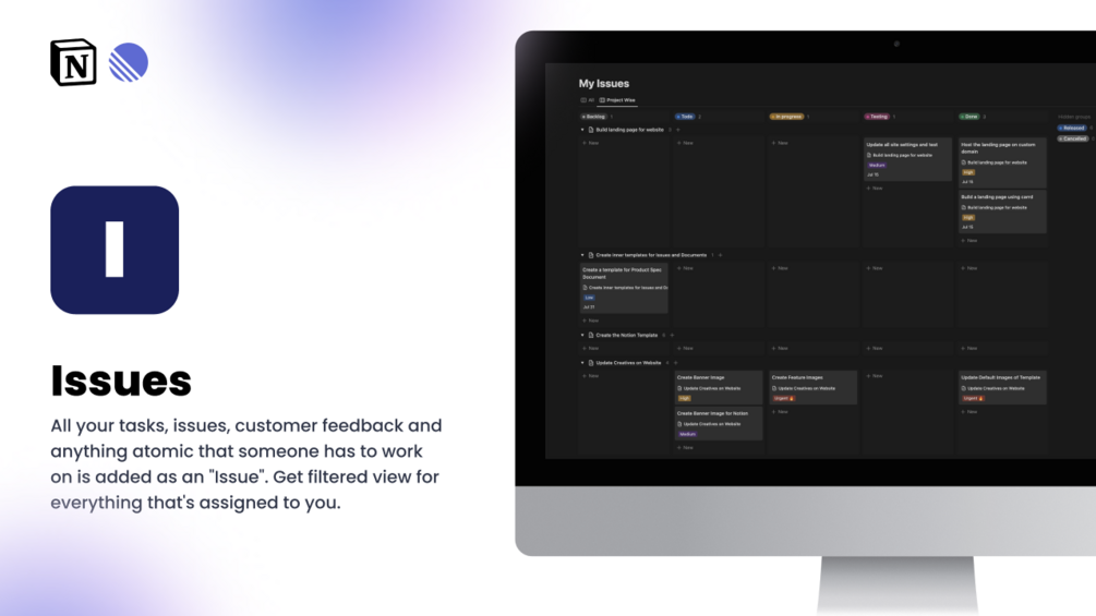 All your tasks, issues, customer feedback and anything atomic that someone has to work on is added as an "Issue". Get a filtered view of everything that's assigned to you.