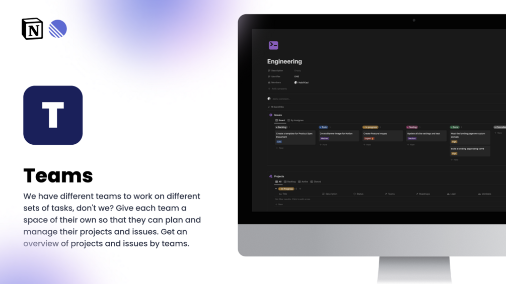 We have different teams to work on different sets of tasks, don't we? Backend team, front-end team, design team etc. What better way to give each team a space of its own so that they can plan and manage their projects and issues?